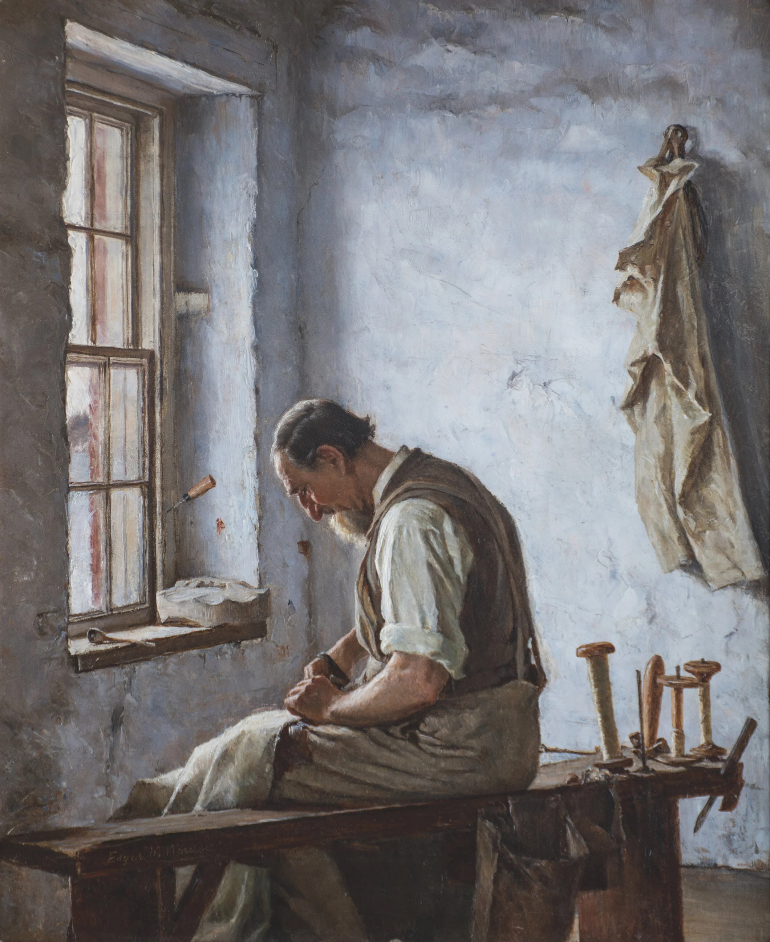 Edgar Melville WardAMERICAN (1839 -1915) The Sail Maker circa 1888Oil on canvas18 x 15 inchesSigned on the bench: Edgar M. Ward